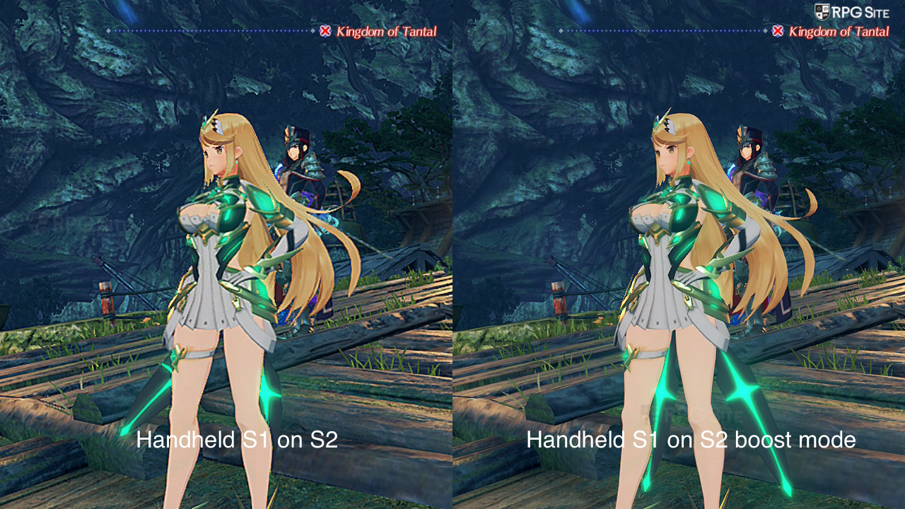 Xenoblade Chronicles 2 is notorious for how it looked handheld and with boost enabled, you see improvements right from the title screen. While it obviously doesn't look as clean as newer Xenoblade games, boost mode helps a ton with post-processing making characters look less oversharpened as you can see with Mythra in the image below. The UI in Xenoblade 2 is also now properly 1080p when playing handheld. Torna also benefits from boost mode, though it already improved on what Xenoblade Chronicles 2 did visually.