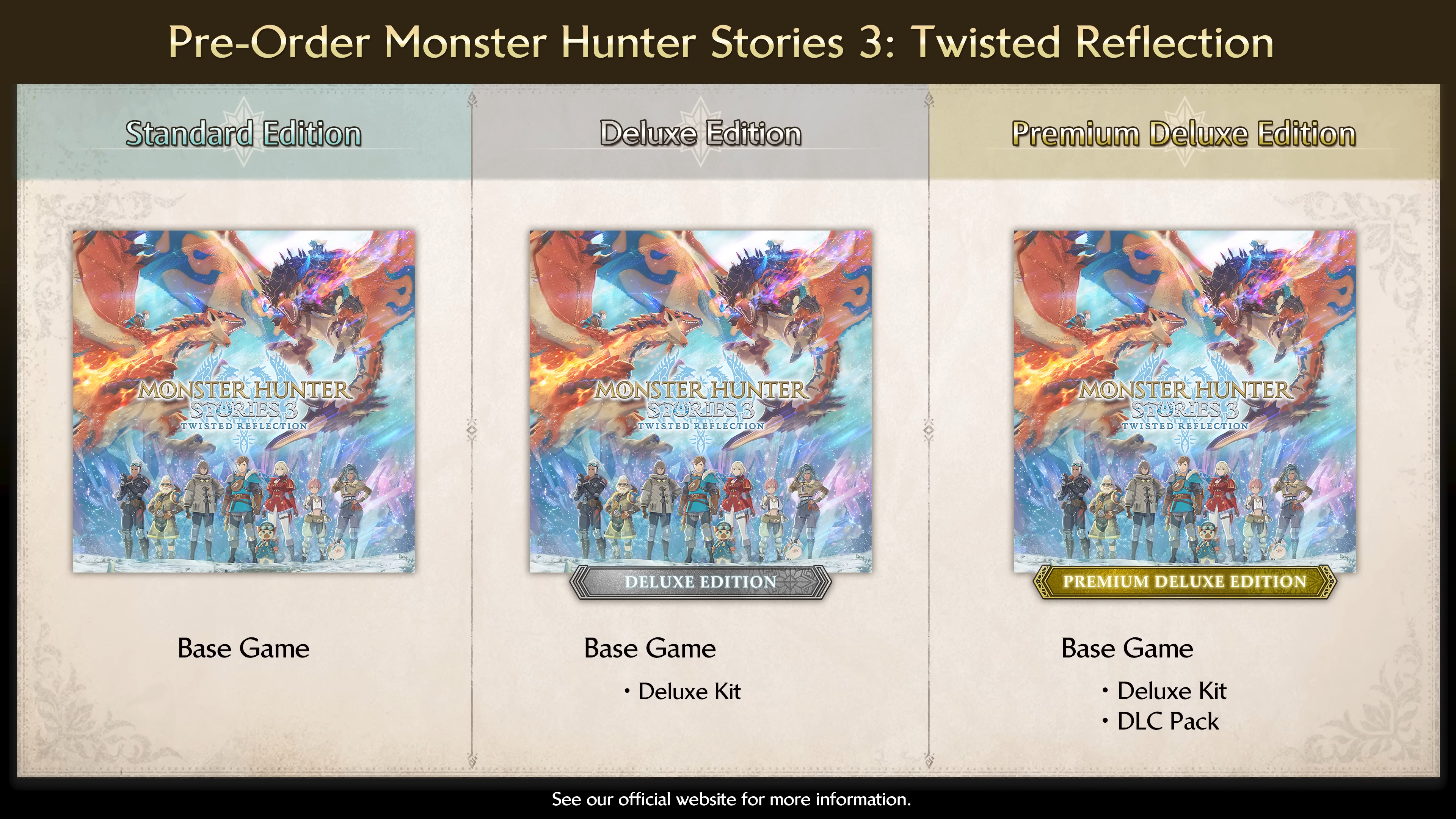 Monster Hunter Stories 3: Twisted Reflection will be available as a standard edition ($69.99), Deluxe Edition ($89.99), and Premium Deluxe Edition ($99.99) with various DLC and cosmetics included. A save data bonus has also been revealed in the pre-order trailer. If you missed it, details for the the Monster Hunter Stories 3 amiibo are here. Pre-orders will be rolling out for all platforms beginning today.