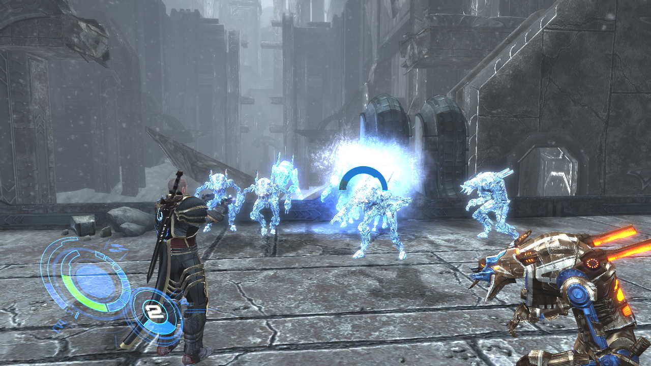 Although the combat system in Ar Tonelico used to be much more of a turn-based affair, Qoga flips the formula on its end and switches to a more high-octane real-time battle system similar to the Tales series. You have your three "vanguards" who are all tasked to protect the defenseless Reyvateils from any bodily harm, who are spending most of the battle singing to accumulate energy that can be used to unleash . Should the enemy get too close inside the "Heroine Field" that surrounds the Reyvateil, their health starts to drop, so players must be quick to expel them outside of the ring, while a cooldown meter controls how quickly a player can do this.
